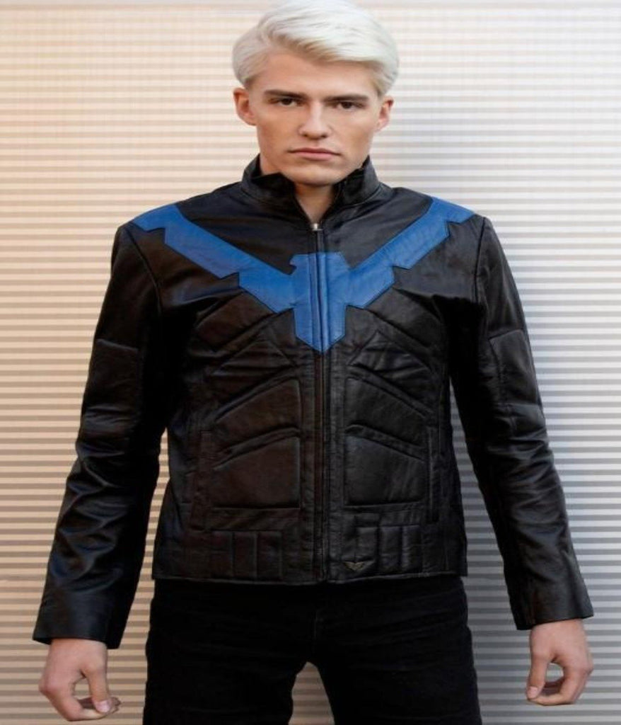 Feel just like the Boy Wonder in this handcrafted Nightwing inspired leather jacket. Created in black leather with the blue eagle logo, inspired by the one worn by the famous action hero “Nightwing” aka Richard John Grayson (Dick Grayson).