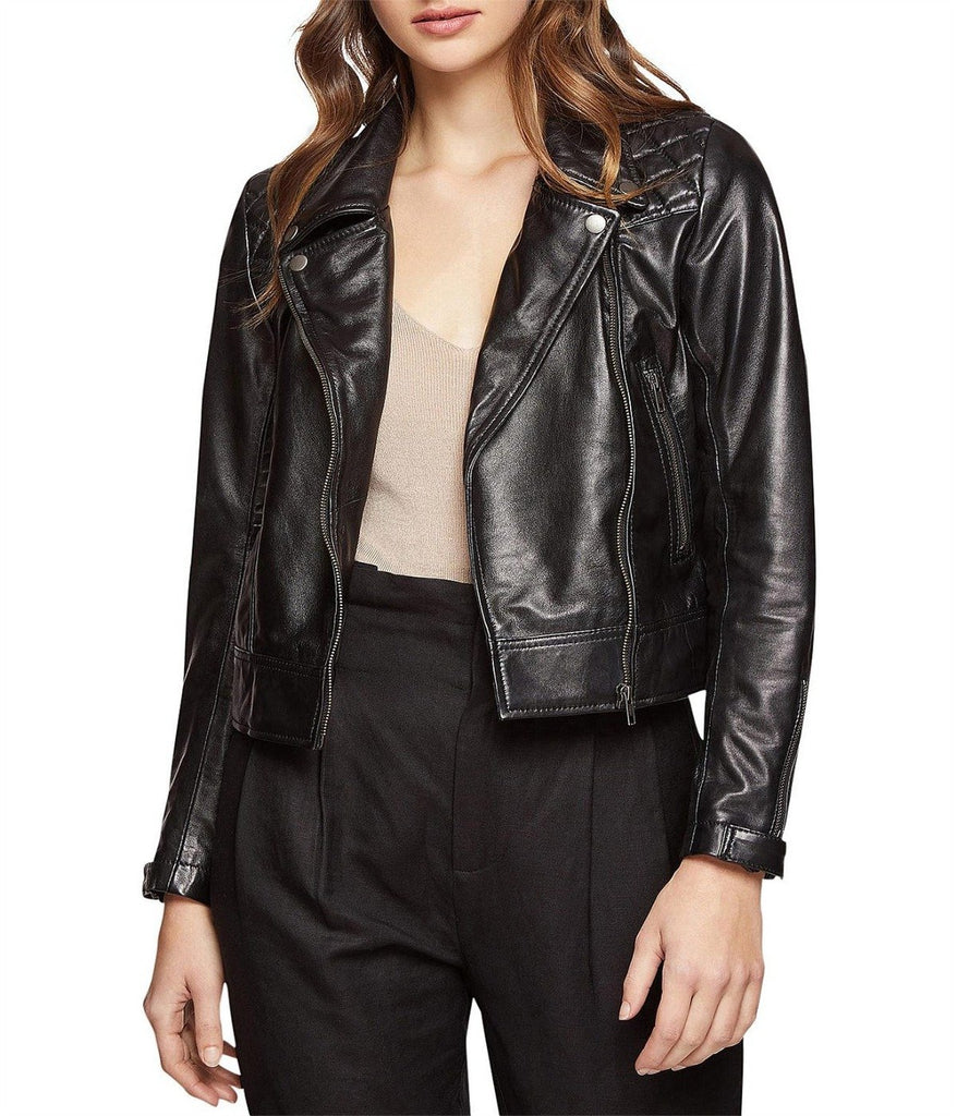 Made from 100% leather, it features two front zipper pockets, press stud cuffs and shoulder detail. Versatile and reliable, this classic jacket can be styled with cropped pants and heels for a strong office look.
